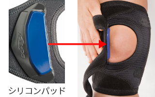 シリコンパッドと両サイドのヒンジが膝蓋骨を側方からサポート |